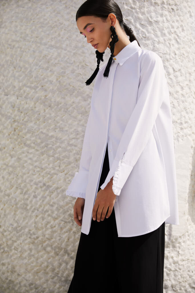 Özenle hazırlanan koleksiyonda, kalite öne çıkarken, kumaş seçimlerinde saten ve poplin dikkat çekiyor. Satenin parlak ve akışkan görüntüsü, koleksiyona şıklık katıyor. Ana parçalardaki bağlama detayları, fırfır, drape, fiyonk ve püskül kullanımı ise bu şıklığa oyuncu bir görünümle hareket kazandırıyor. Katlı görünümler özellikle etek ve elbiselerde fark yaratıyor.