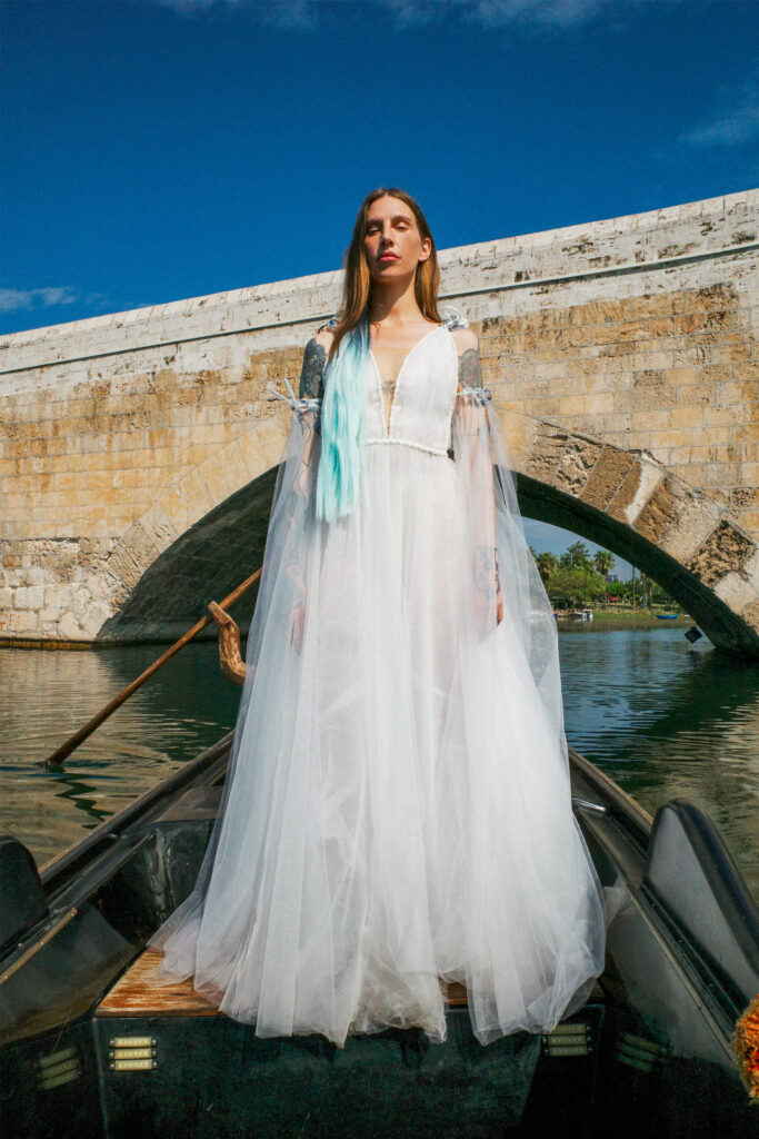 | Filmde, Hacettepe Üniversitesi Konservatuvarı’ndan tiyatro oyuncusu iki eskrimci çeşitli aksiyon sahnelerinde her iki krallığın elçileri olarak kadraja giriyorlar. Kralın genç güzel kızını canlandıran İstanbul Modern Dans Topluluğu dansçısı Huri Murphy’le birlikte tüm karakterleri, Anavarza Kalesi’nden Kazancılar Çarşısı’na, Atatürk Parkı’ndan Seyhan Nehri’ndeki romantik bir gondol sahnesine kadar bir çok noktada izliyoruz. Filmin izleğini oluşturan majör element ise tüm hikâyenin bir bilgisayar oyunu dünyasında geçtiğini sürekli hissettirmesi. Sudi Etuz’un bir önceki sezon filminden aşina olduğumuz başrol karakterin bir avatar olduğunu ve oyundan çıkış yolları aradığını anlıyoruz. Yer yer büyülü gerçekçiliğe göz kırpan anlatımıyla Sudi Etuz, aşkın ve savaşın tüm taraflarını izleyiciyle birlikte büyük düello sahnesine hazırlıyor.Koleksiyonu Sudi Etuz imzası taşıyan tüller, sürdürülebilir denim kumaşlar, sürdürülebilir ketenler, geri dönüşüm polyester fistolarla hayat bulan 35 parçadan oluşuyor. Beyaz, siyah dengesinde pastel tonlarda mavi, sarı ve bejler sezonun sıcaklığına eşlik ediyor. Bra etkisinde farklı bağlama teknikleriyle birleştirilmiş mikro üstler, pleksi boncuk detaylı yarı transparan denim pantolonlar Güneş Dericioğlu’nun çanta ve aksesuarlarıyla kombinleniyor. |