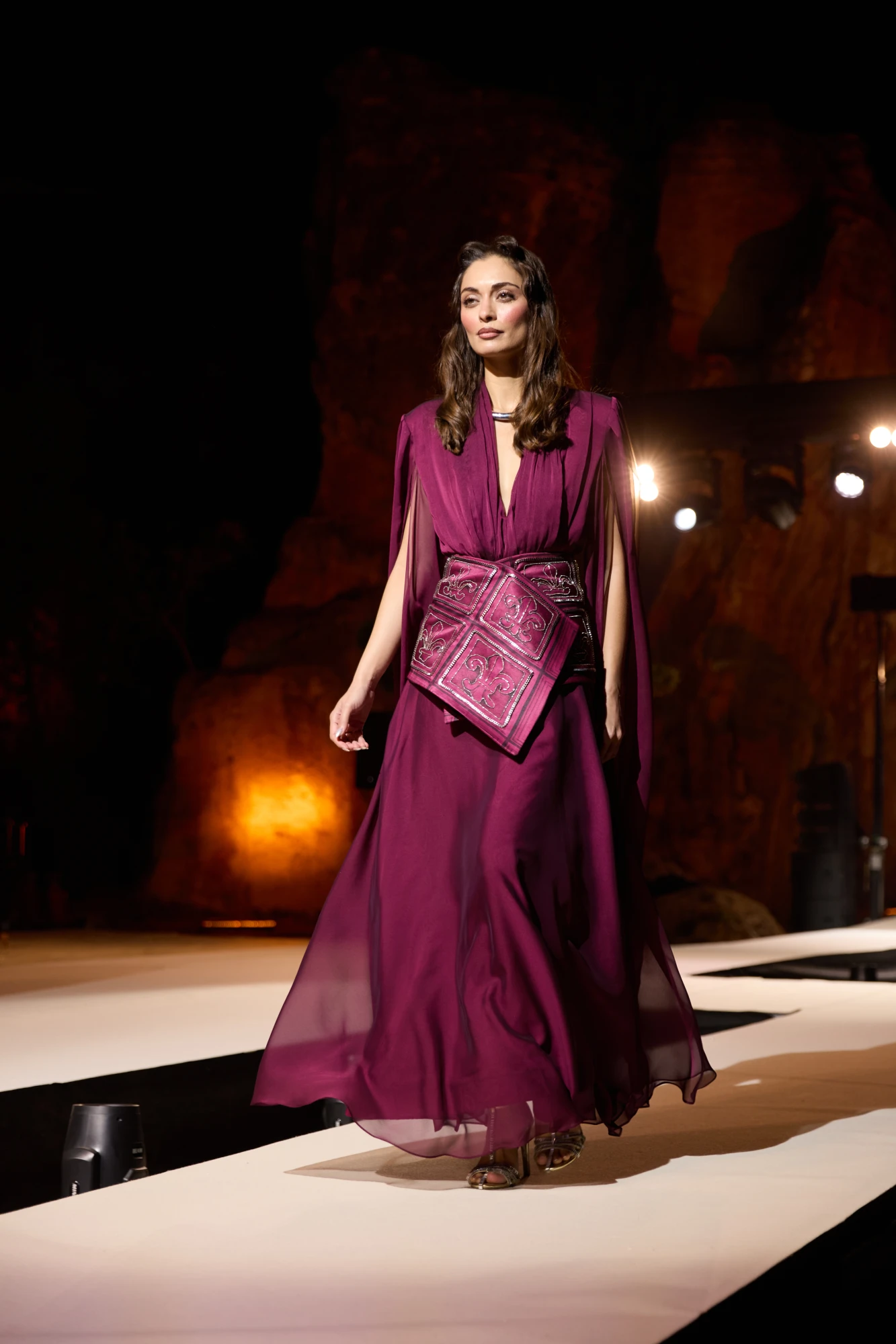 Defilenin ilk bolümü Doliche Antik Kenti’nden esinlenerek Antik Roma’ya atıfta bulunan siluetler detaylar ve renklerden oluşuyor. Drape şifon elbiselere deri korseler eşlik ederken mozaik baskılar ve desenlerinden el işlemeleri sıkça görünüyor.